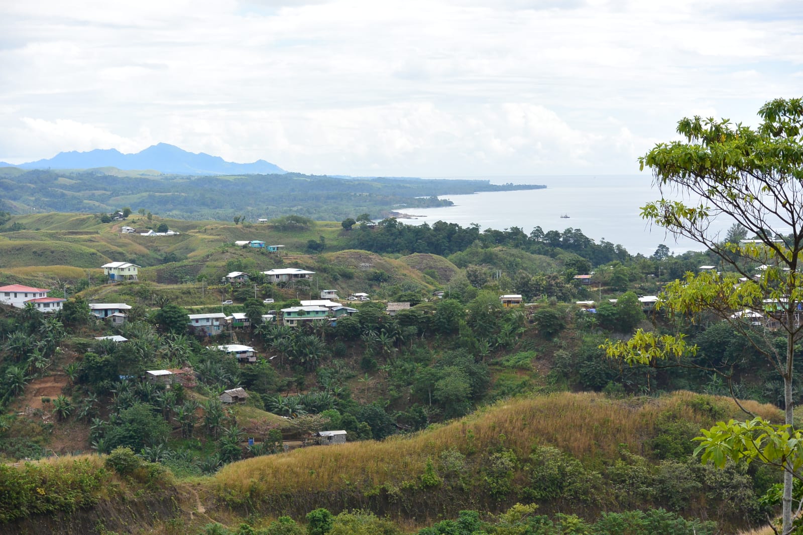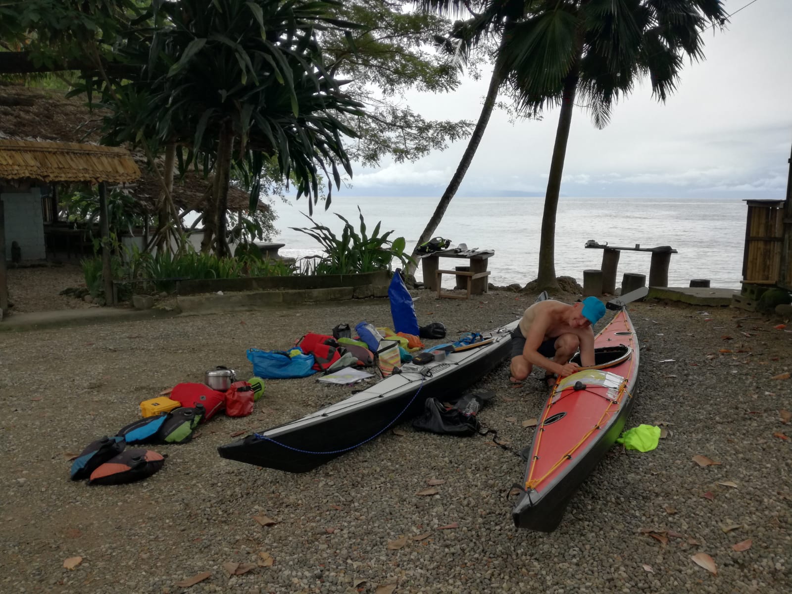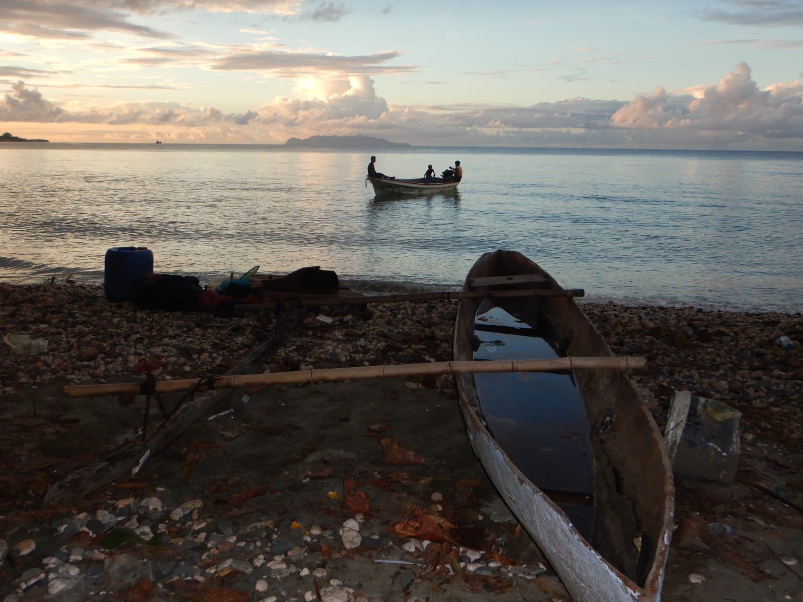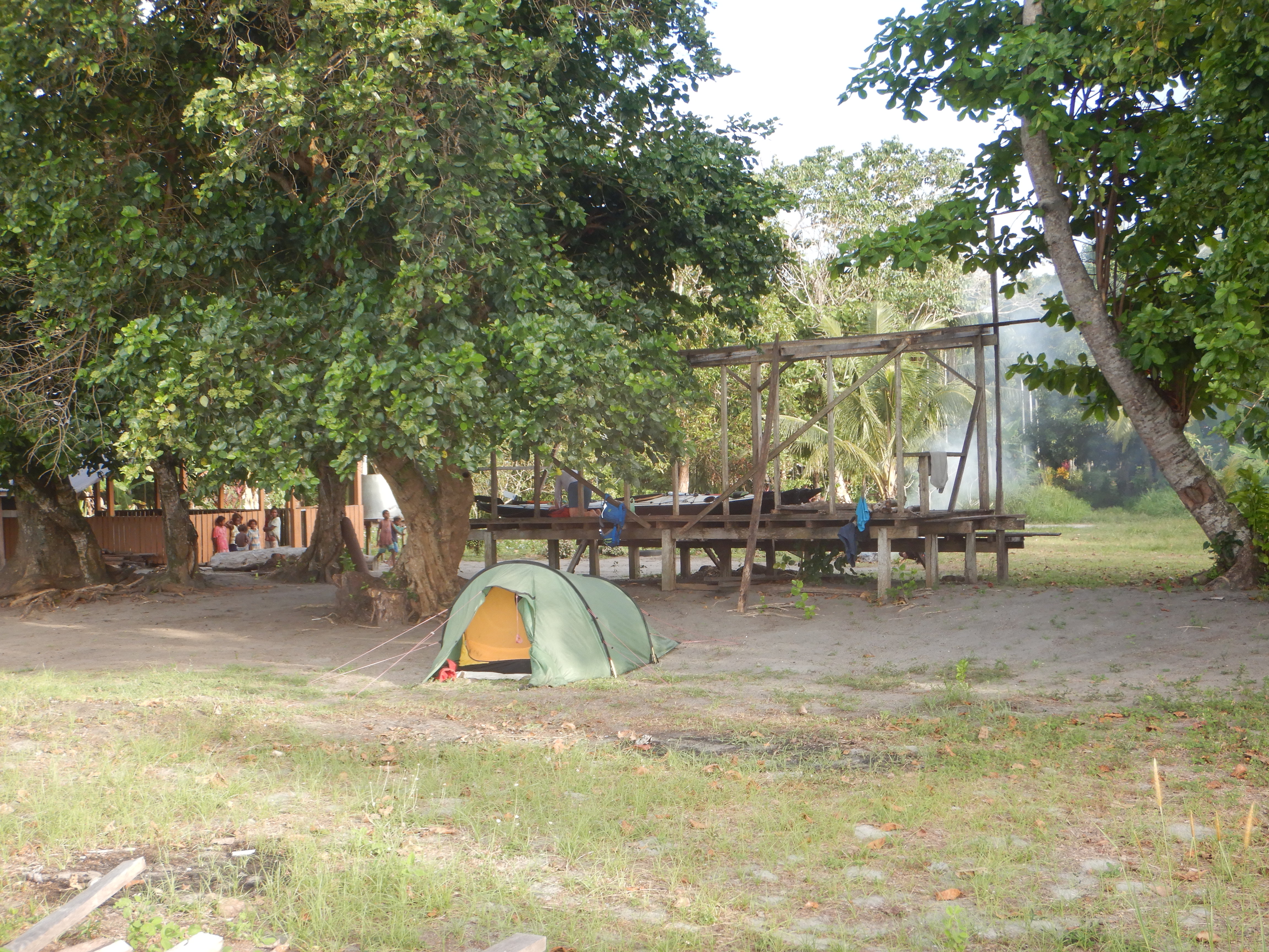 It still takes us most of the morning to get ready. At around 10am we are packed up and so we make our way up along the island to the West Peak. On the way we come across little huts and settlements and. We are especially welcomed by the screaming kids. We stop at an inviting looking village, also because of a little store we saw there. To our surprise the shop is operated by catholic nun and they only have orange fizz and cracker. But the nun speaks English very well and so she sits down next to us and tells us about the facility where we landed. It is a girls school that communicates a range of jobs. At the moment though the kids are all on holidays. We say goodbye and paddle another 10km until we reach the starting point for our crossing tomorrow. We find a spot next to a half collapsed hut to set up our tent and ask if it was okay to stay the night here. The residents take us the chief, but at this time he was out of the village so they decide to let us stay the night. Later we meet the chief and he tells us that this is safe place for us. Our canoes are taken to a broken down hut, where they are quickly and fully examined by the whole village. The chief also gives us a couple tips about where to stay on the other islands, where to find water or how to deal with crocodiles. As we go to bed, first the chiefs son watches over our kayaks and later the chief himself. We are quite impressed!